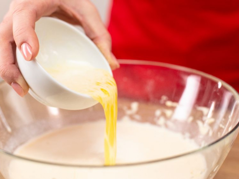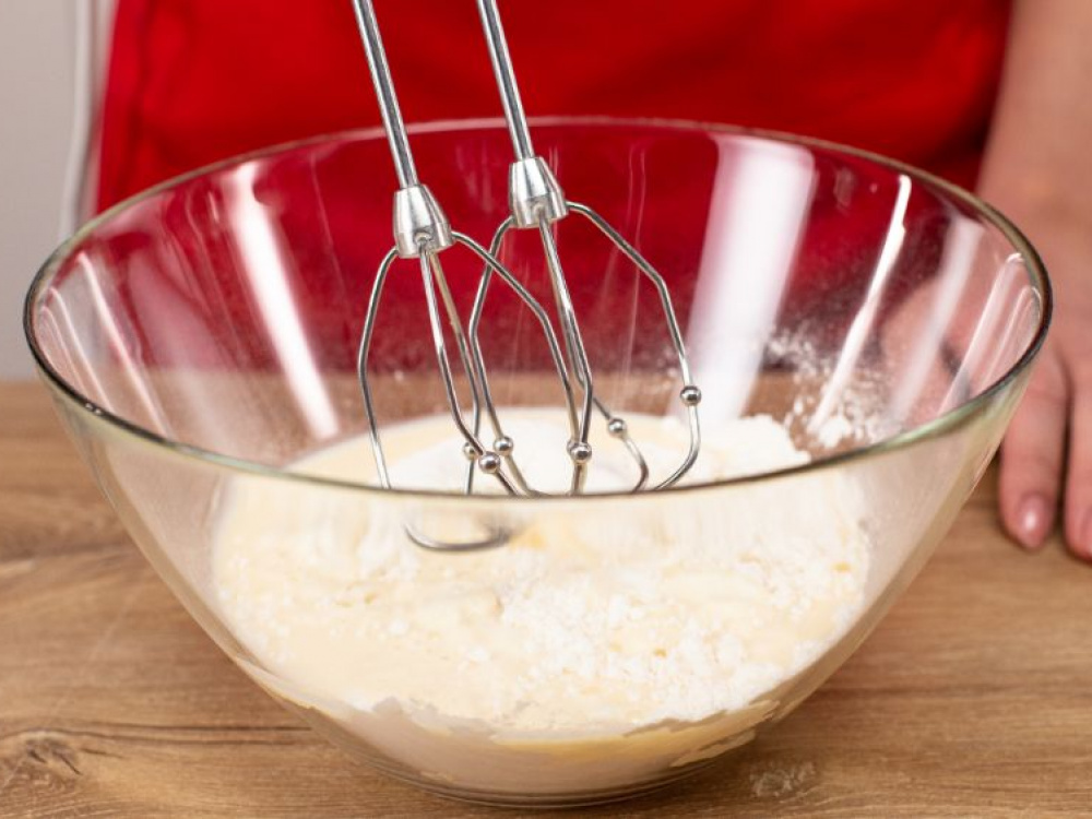 Добавить к сухой смеси ингредиентов половину молочной и тщательно перемешать миксером или венчиком до образования густого теста без комочков. Добавить оставшуюся молочную смесь и еще раз перемешать (при необходимости отрегулировать консистенцию теста, добавив большее количество молока или муки).