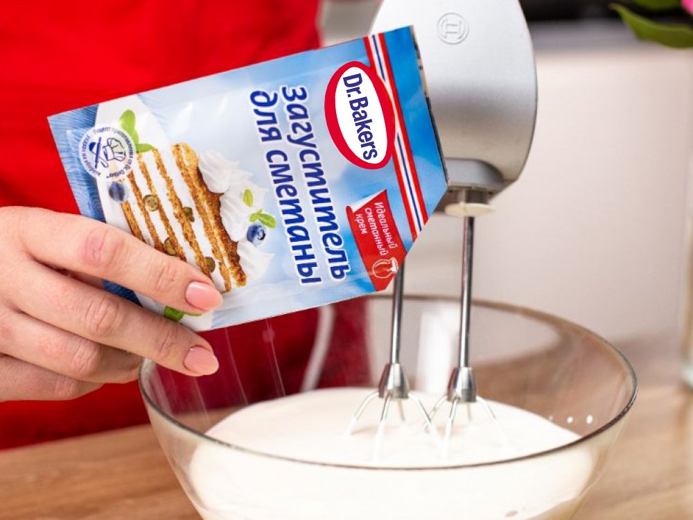 Для крема сильно охлажденную сметану взбить в течение минуты. Продолжая взбивать, добавить загуститель для сметаны и ванилин-интенсив Dr. Bakers. Взбивать в течение еще одной минуты, добавляя порциями сахарную пудру универсальную Dr. Bakers. Убрать крем в холодильник до момента сборки торта.
