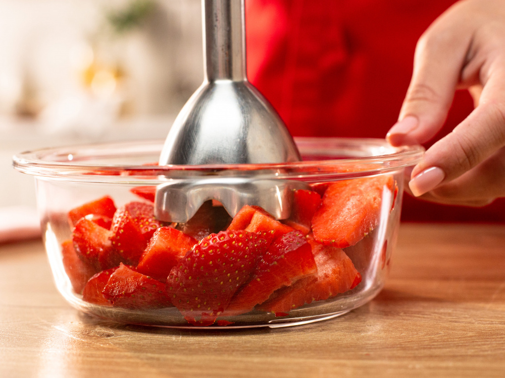 100 г клубники измельчаем с помощью блендера и протираем через сито: должно получиться 75 г пюре.