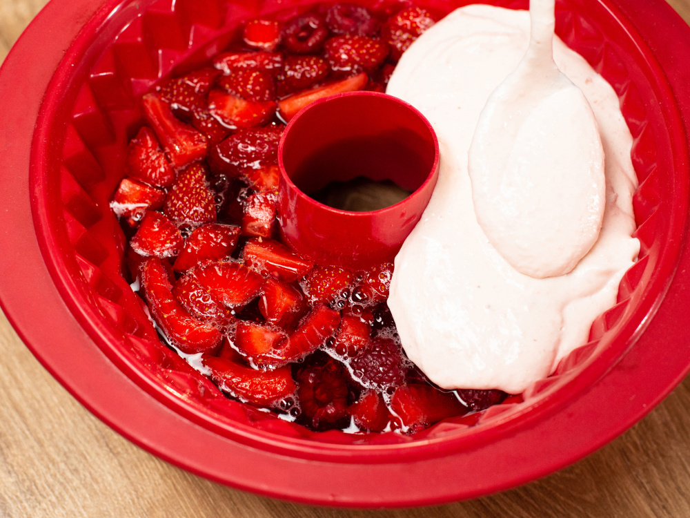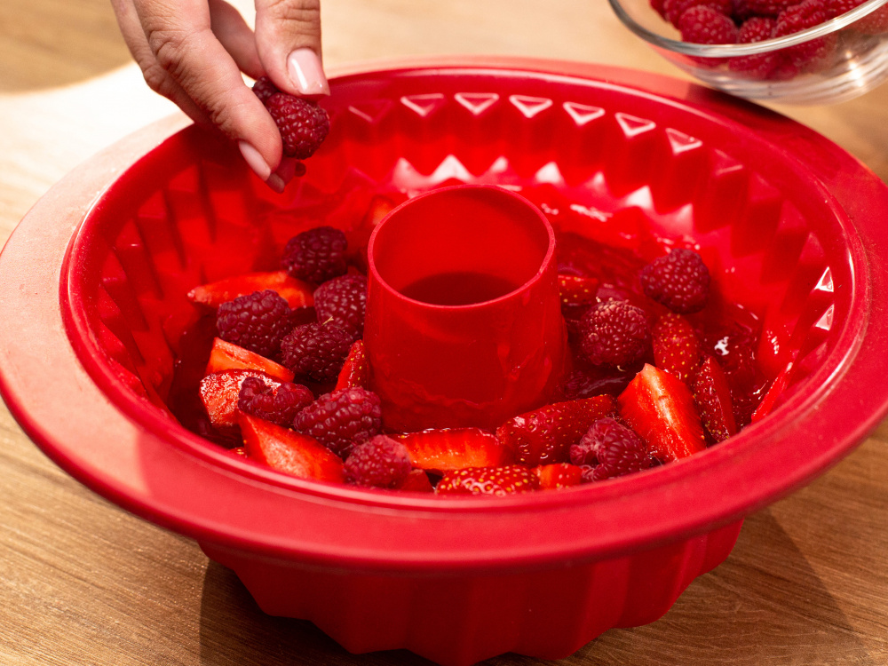 Добавляем в загустевшее желе нарезанную клубнику вместе с охлажденной малиной и аккуратно перемешиваем. (Ягоды должны равномерно распределиться в загустевшем желе). Убираем форму в холодильник до полного застывания (3 часа).