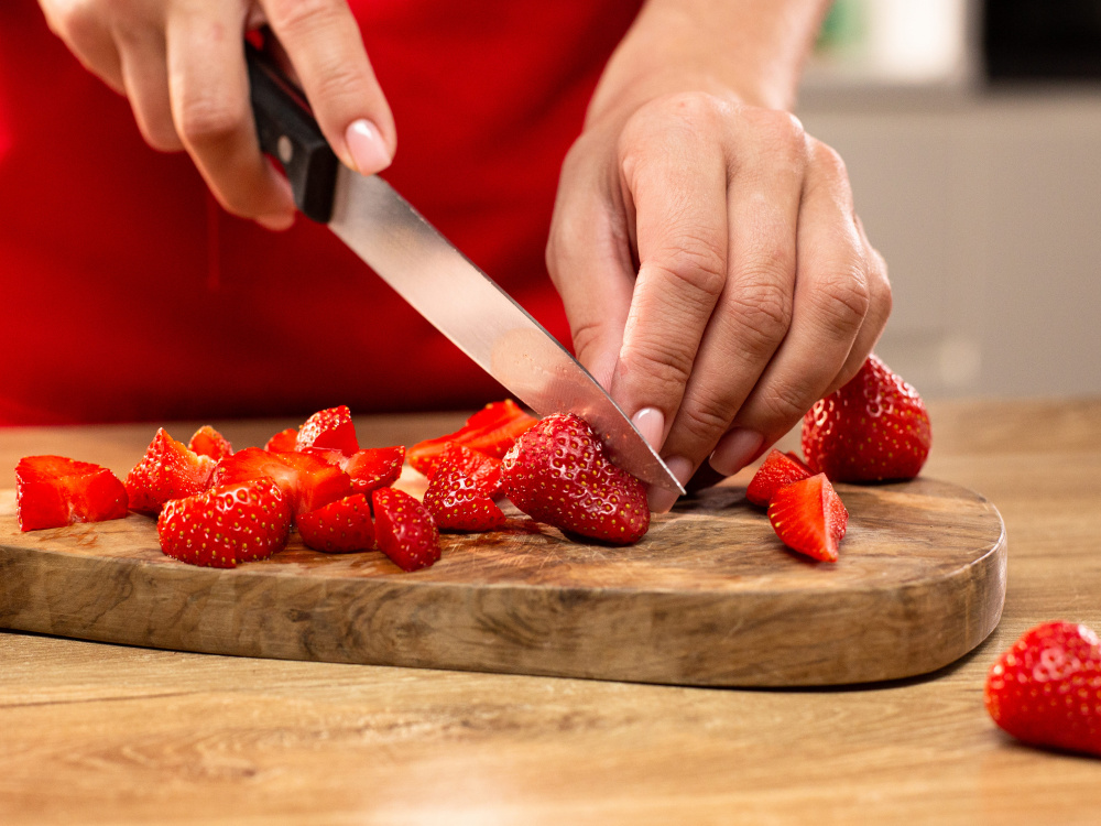 Нарезаем 300 г охлажденной клубники дольками и возвращаем в холодильник.