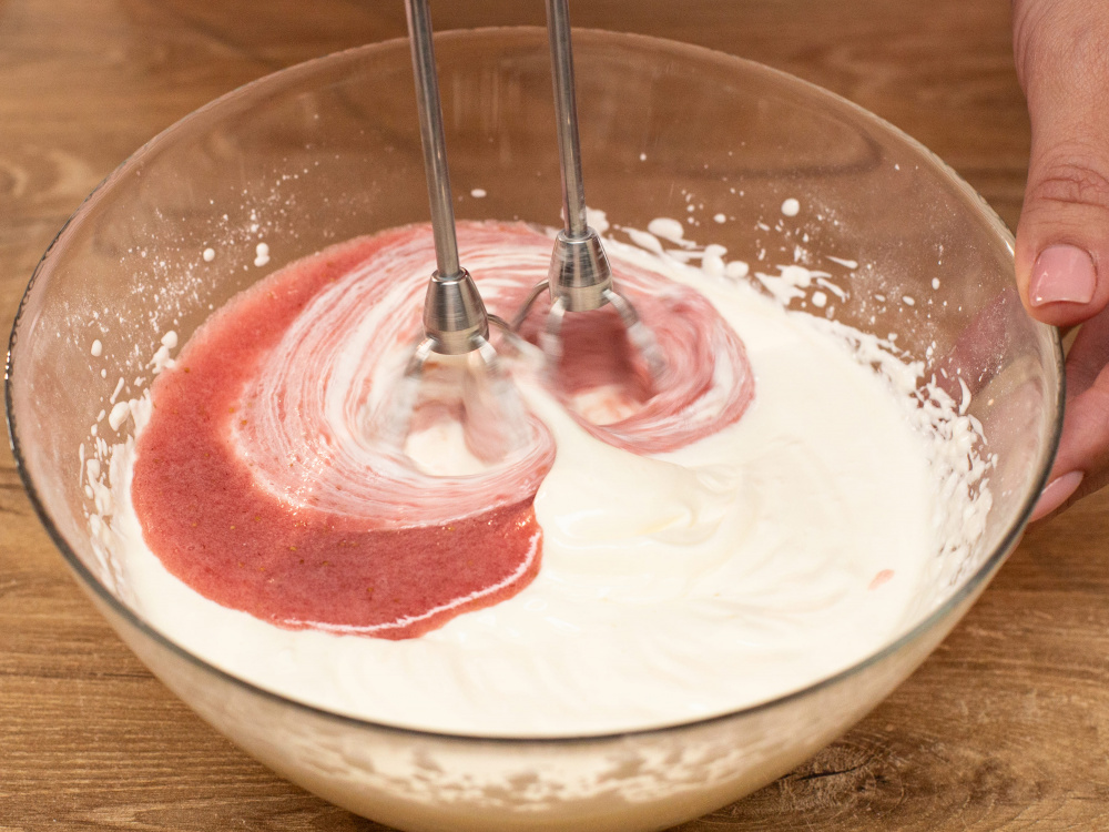 Добавляем клубнично-желатиновую смесь и еще раз взбиваем до получения однородной массы.