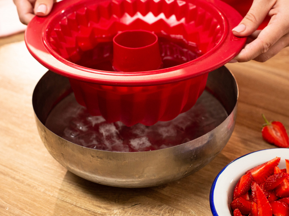 Выливаем желе в форму для торта и помещаем ее в миску, наполненную водой со льдом. Аккуратно помешиваем смесь до легкого загустения.