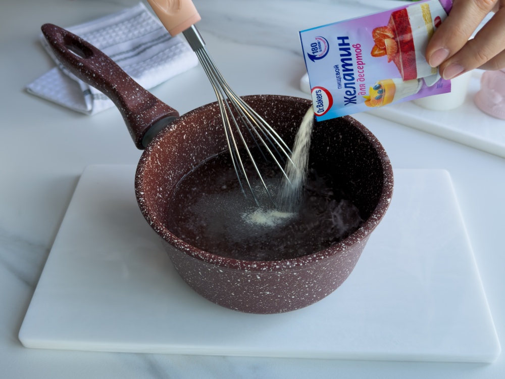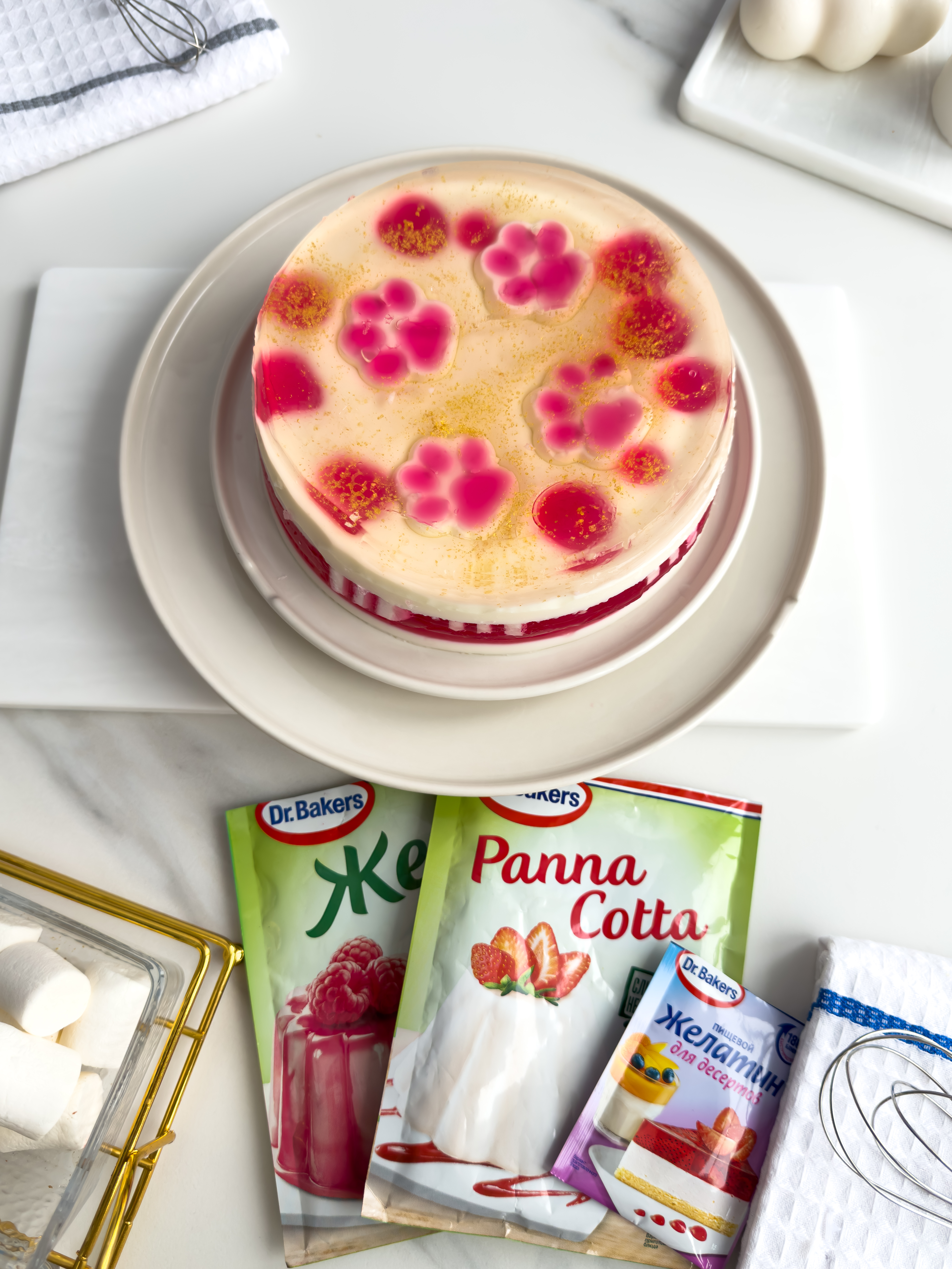 Готовим прозрачный слой желейного торта. Желатин для десертов Dr. Bakers (10 г) заливаем сладким сильногазированным напитком со вкусом лимона и лайма (500 мл), тщательно перемешиваем и оставляем до набухания желатина. Прогреваем до полного растворения, не доводя до кипения, а затем остужаем до комнатной температуры. Готовим декор. Часть малинового и вишнёвого желе разливаем по силиконовым формам, формируя тем самым лапки и ягодки. Убираем в холодильник до полной стабилизации. Для полосатого декора берём форму примерно 7 на 7 см. Поочередно заливаем белым и красным слоями. Каждый слой полностью охлаждаем перед заливкой следующего. После полной стабилизации (4 часа в холодильнике) нарезаем на кубики или полоски.