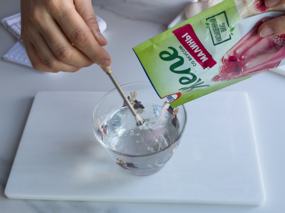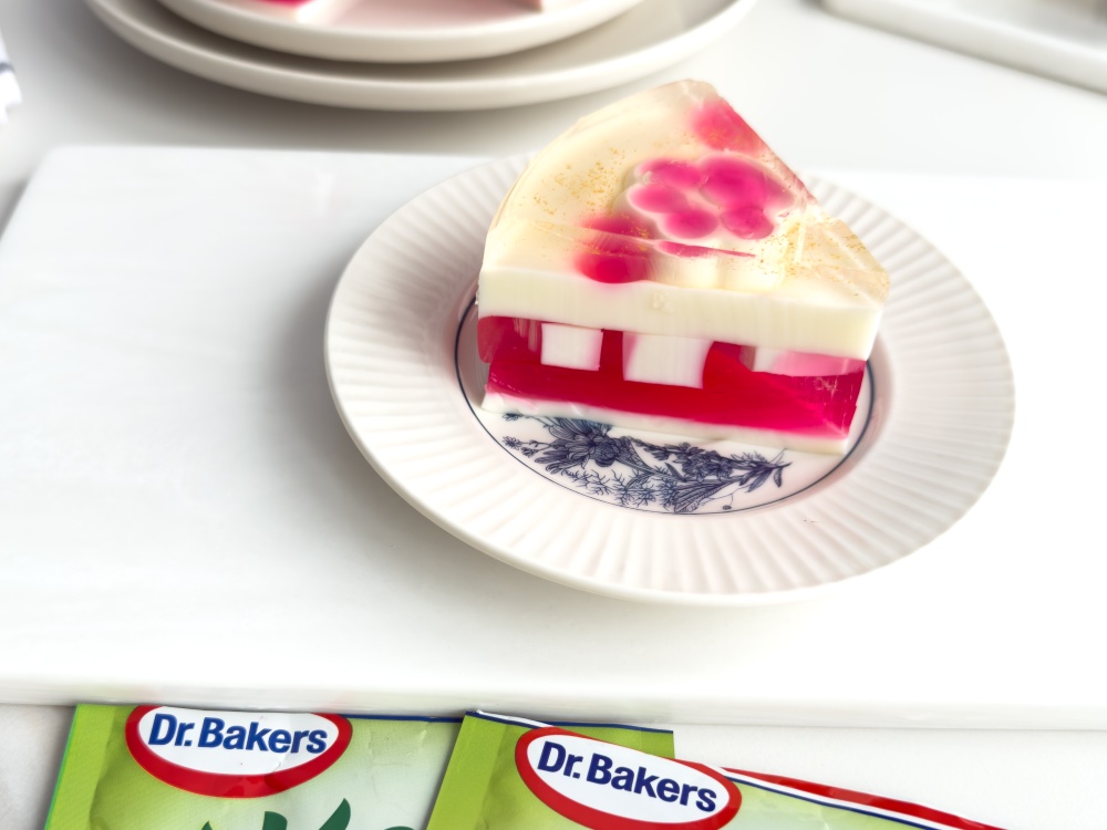 Готовим розовый слой желе. Воду (200 мл) доводим до кипения, снимаем с огня. Всыпаем в ёмкость с водой смесь «Желе со вкусом малины» Dr. Bakers (45 г). Тщательно перемешиваем до полного растворения, а затем остужаем до комнатной температуры. Готовим красный слой желе. Воду (200 мл) доводим до кипения, снимаем с огня. Всыпаем в ёмкость с водой смесь «Желе со вкусом вишни и черешни» Dr. Bakers (45 г). Тщательно перемешиваем до полного растворения, а затем остужаем до комнатной температуры.