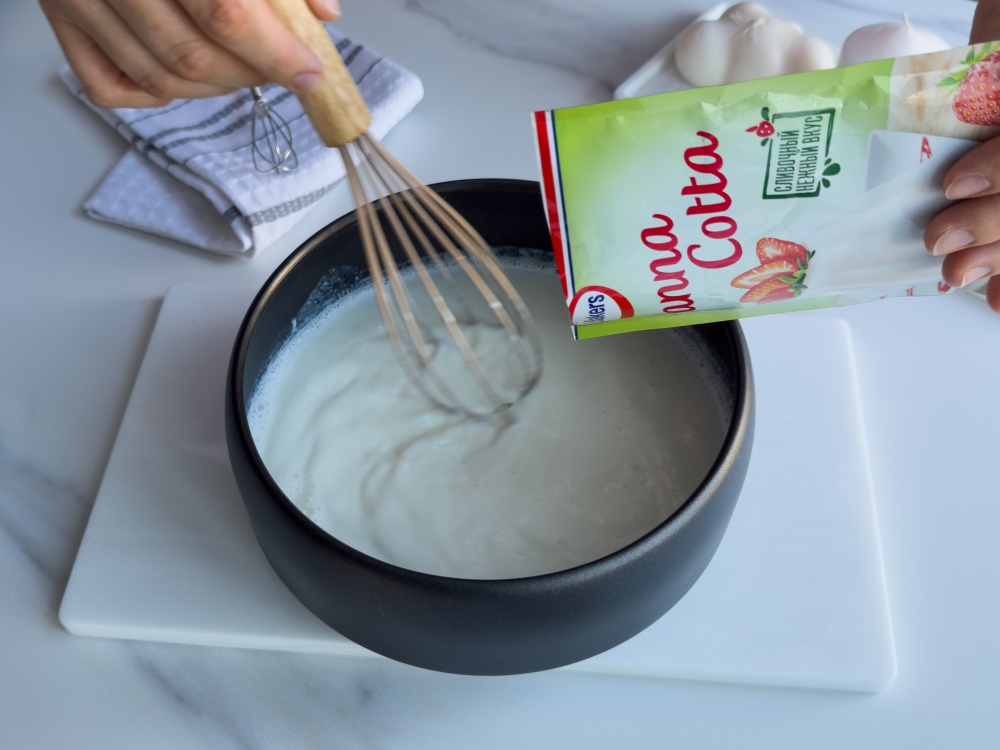 Готовим панна котту. Смешиваем молоко (300 мл) и сливки (200 мл). Доводим до кипения и снимаем с огня. Постоянно помешивая, добавляем содержимое упаковки десерта «Панна котта» Dr. Bakers (67 г) и варим на медленном огне 2 минуты. Сняв с огня и немного остудив до тёплого состояния.