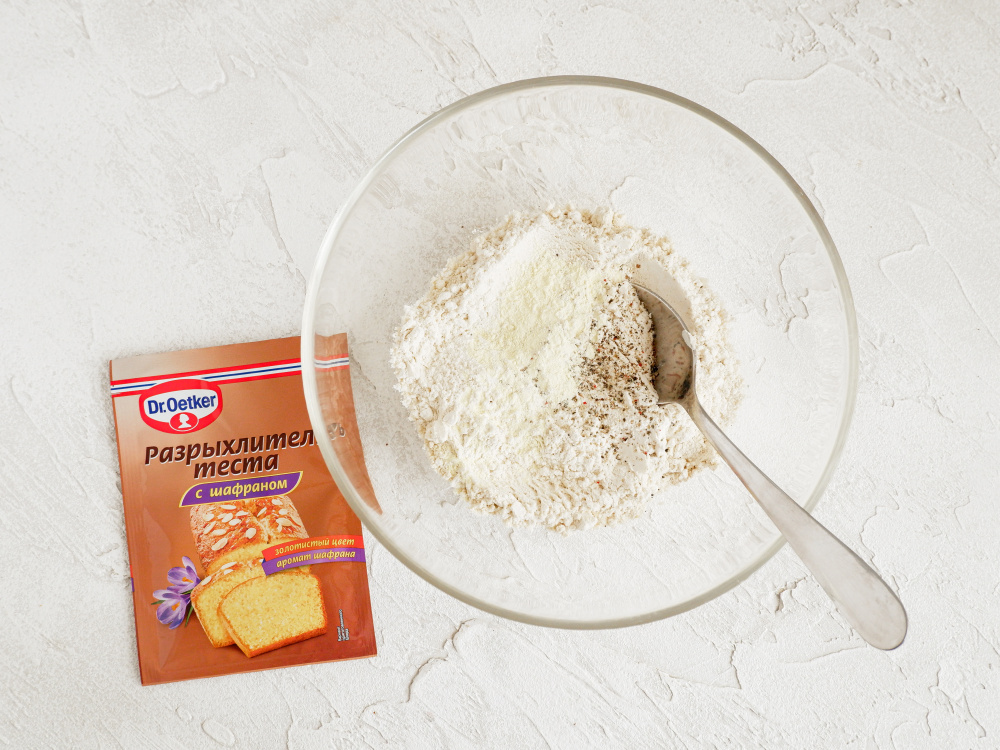 Смешиваем в миске просеянную муку с разрыхлителем, солью и любимыми специями.