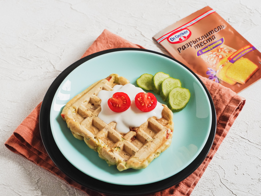 Овощи режем мелкими кубиками, добавляем в тесто вместе с зеленью, перемешиваем. Заранее разогреваем вафельницу. Выкладываем тесто и печем каждую вафельку по 5-7 минут, пока не зарумянится. Подаем овощные вафли вместе с томатным соусом или несладким йогуртом (греческим), свежими помидорами, ломтиками огурца. Можно сверху посыпать рубленой зеленью.