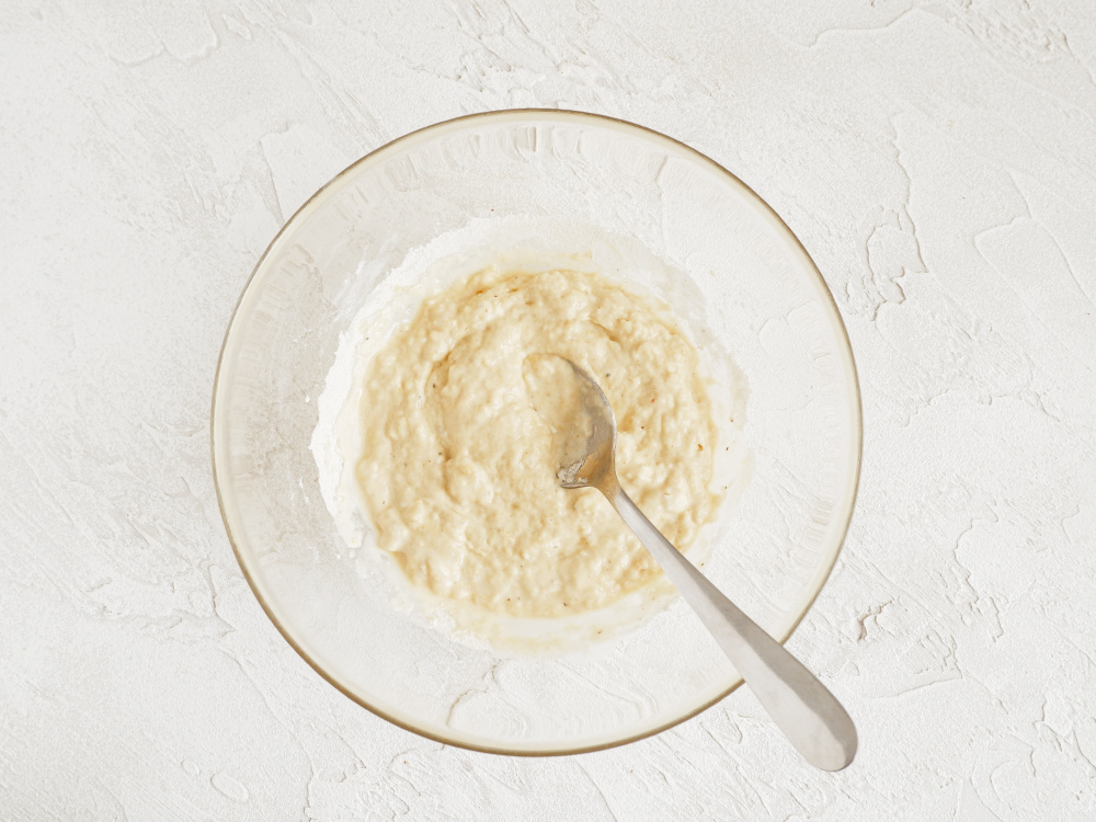 Добавляем куриное яйцо, оливковое масло. Разбавим все это полстаканом воды. Перемешаем венчиком или ложкой. Если тесто получается не очень густым, стекает с ложки, то добавим муки. Если, наоборот, оно слишком густое – введем еще немного воды. Масса должна быть гуще сметаны.