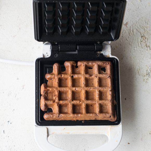 Электрическую вафельницу слегка смазываем растительным маслом и разогреваем. Заполняем выемки тестом и выпекаем шоколадные вафли в течение 3-5 минут.