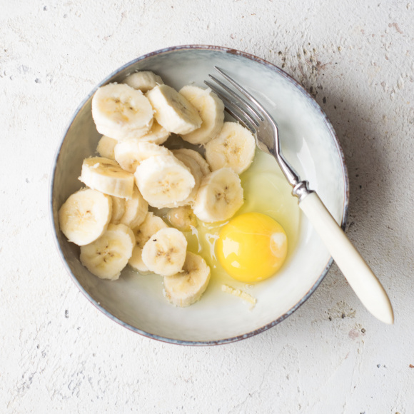 Банан нарезаем кусочками и разминаем вилкой в мягкую массу. Добавляем к банану 1 яйцо и перемешиваем.
