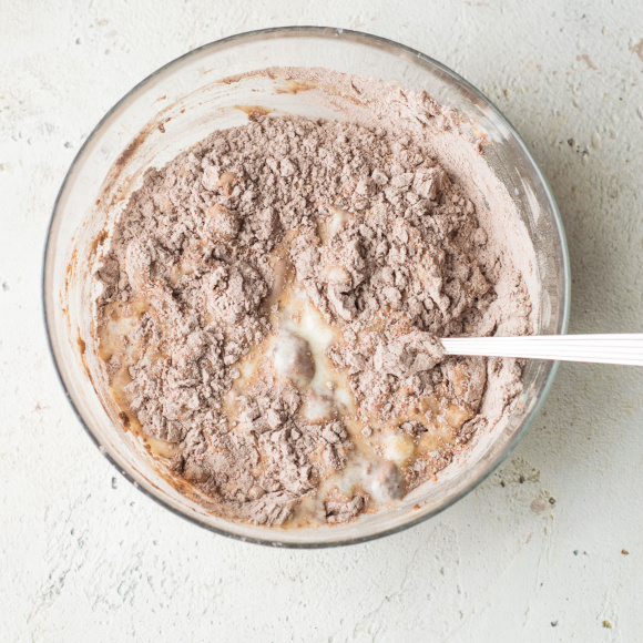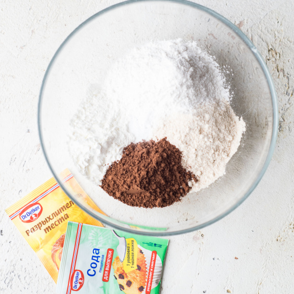 В глубокую ёмкость просеиваем муку полбы (можно заменить на миндальную) и рисовую муку. Добавляем какао Dr. Bakers, кукурузный крахмал Dr. Bakers, разрыхлитель Dr. Bakers и соду Dr. Bakers. При помощи венчика перемешиваем сухие ингредиенты до получения однородной массы.