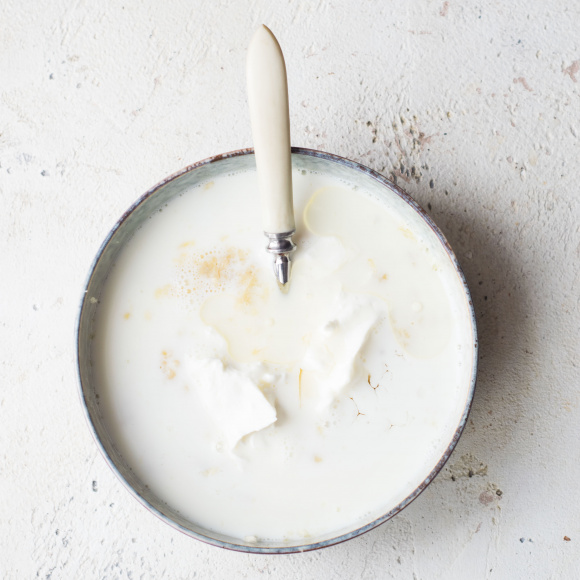 Йогурт (предпочтительно без добавок) перекладываем в миску, добавляем молоко, сироп или мед, 2 ст. ложки оливкового масла (можно заменить рафинированным подсолнечным), перемешиваем ингредиенты, после чего соединяем данную смесь с яично-банановой.