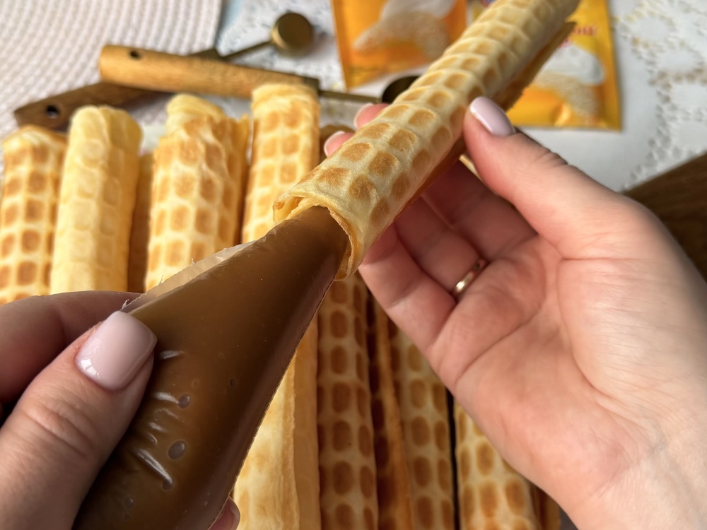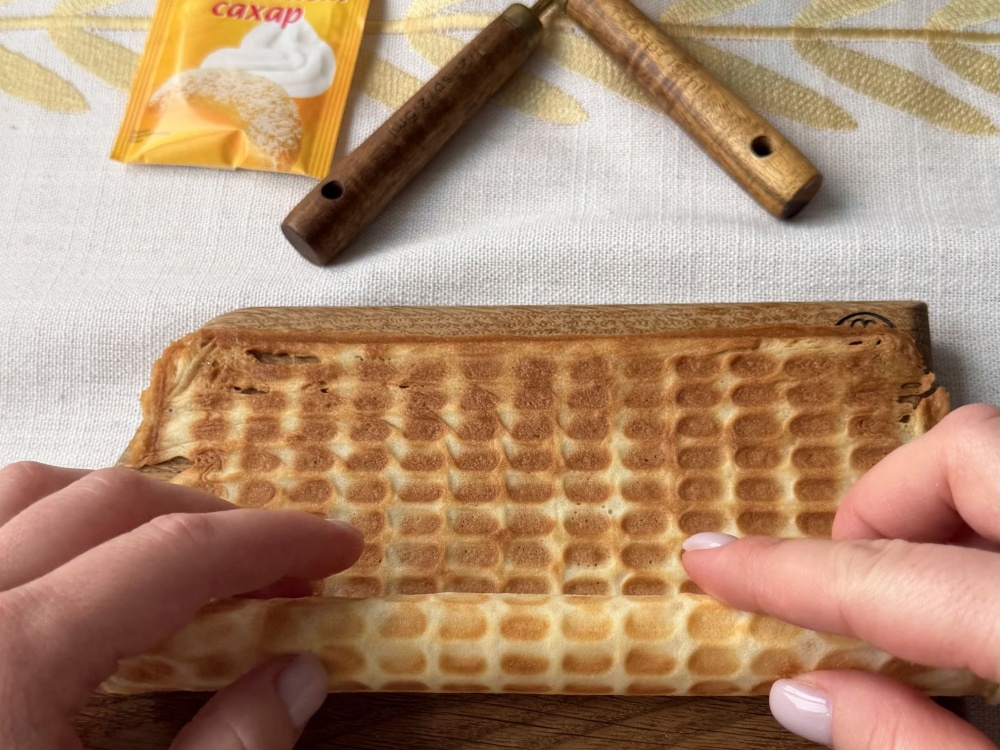Чтобы получилась трубочка, рецепт такой — сворачиваем пока не остыла. Если не успели, то лучше оставь так, иначе сломаете.