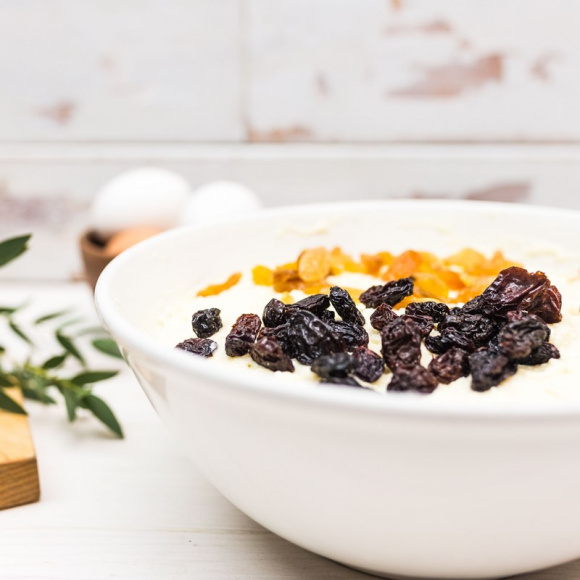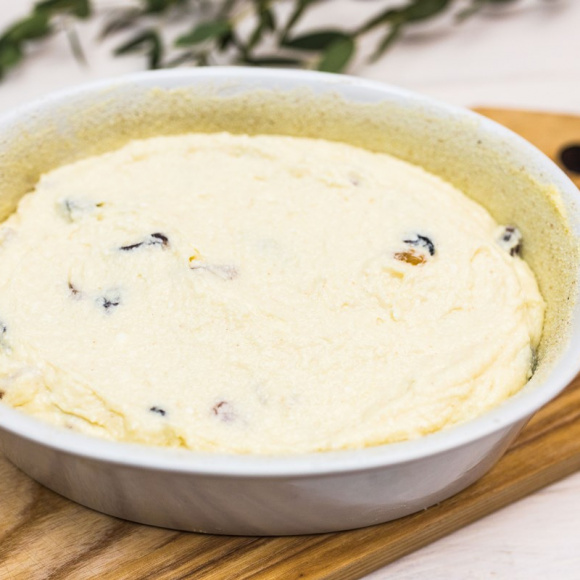 Изюм без косточек промыть проточной водой, обдать кипятком и просушить с помощью бумажных полотенец. Вмешать в тесто для запеканки.