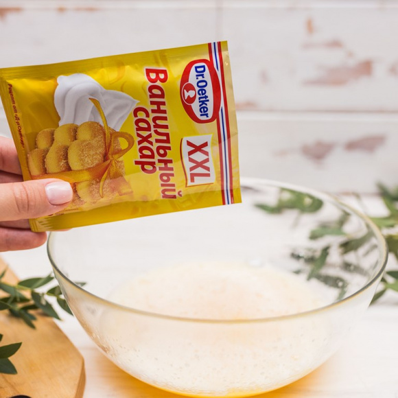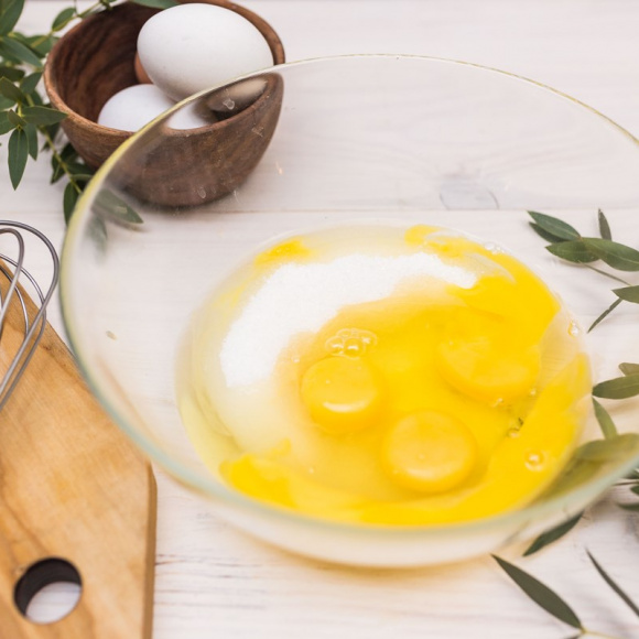 Охлажденные куриные яйца взбиваем с сахарным песком с помощью миксера, пока масса не посветлеет и не увеличится в объеме.