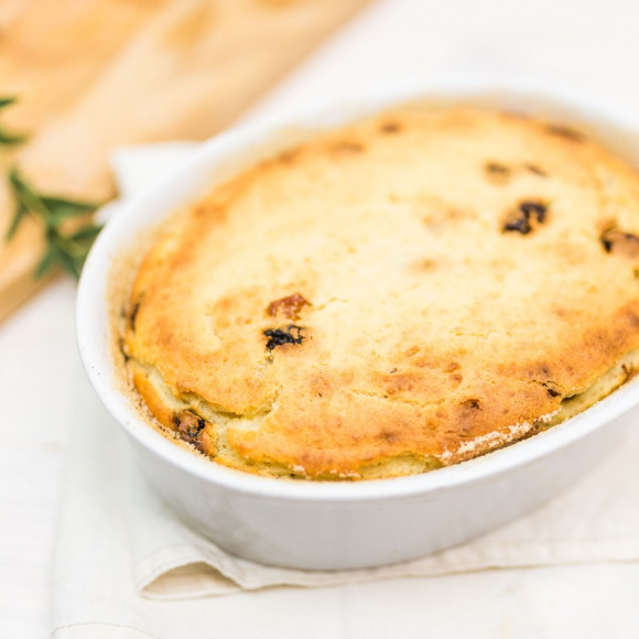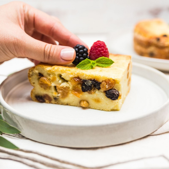 Разогреть духовку до 160 градусов. Поставить противень с формой на среднюю полку духовки и выпекать 35–40 минут до образования золотистой корочки. Проверить готовность можно зубочисткой или деревянной шпажкой. Если выходит сухая – можно доставать запеканку из духовки. Вынуть из формы и слегка остудить.