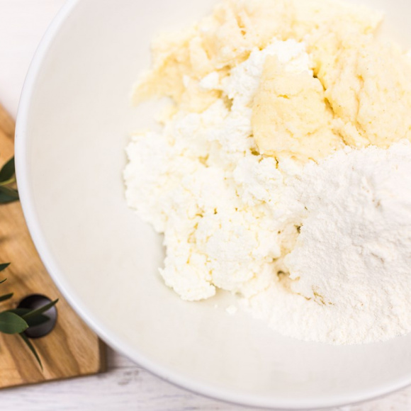 Протертый с помощью блендера или пестика творог смешиваем с готовой манной кашей и просеянной мукой высшего сорта.
