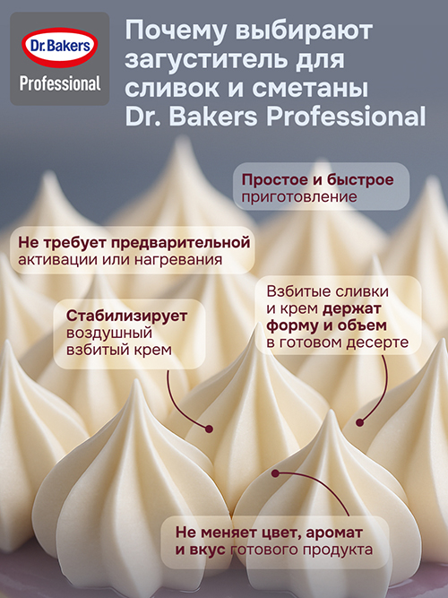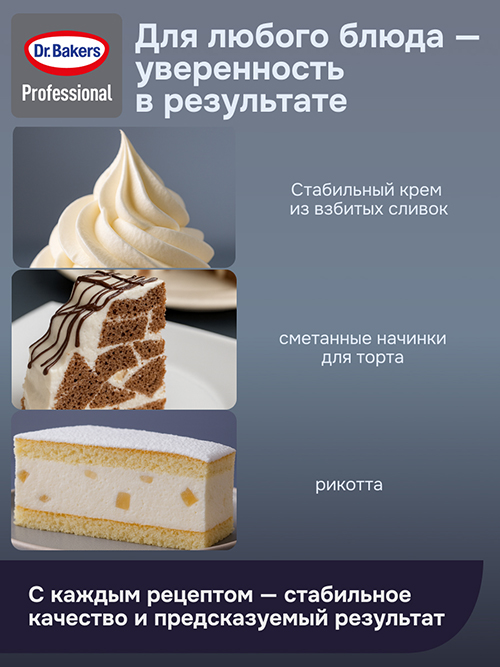 Загущает и стабилизирует сливки, сметану, крема, начинки или десерты на молочной основе (сметана, сливки, Рикотта и т.д.). Не требует предварительной активации или нагрева.